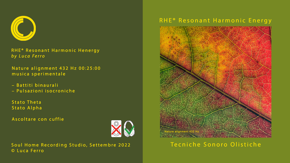 Le informazioni e le tecniche contenute in questo file hanno puro carattere educativo, divulgativo e informativo, non terapeutico o psicologico, e non intendono sostituirsi alle comuni terapie mediche, per le diagnosi e le terapie si consiglia sempre di consultare un medico di fiducia. In nessun modo il compositore è da ritenere responsabile del suo utilizzo proprio o improprio. / Tutto il materiale audio e video si deve ritenere esclusivamente ad uso personale. / Non ascoltare durante la guida di un veicolo, durante l’uso di macchinari, in gravidanza o se portatori di pacemaker. / RHE® Resonant Harmonic Energy è un marchio depositato, tutti i diritti sono riservati.